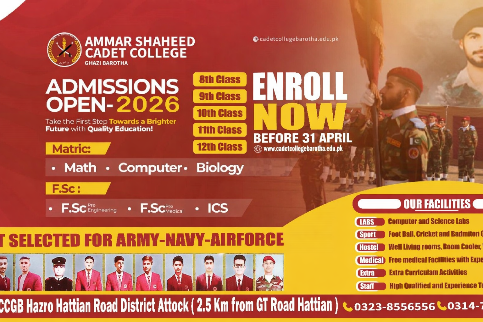 The curriculum as spelled out by Federal Board of Intermediate & Secondary Education Islamabad is followed at Ammar Shaheed Cadet College Ghazi Barotha.
